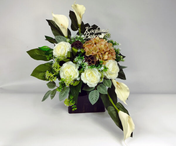 Kompozycja Oriventa to piękny stroik nagrobny na podwyższanej ozdobnej białej donicy, z delikatnymi złoceniami. Dzięki możliwości doboru napisu jest dobrym wyborem, aby w Dzień Babci, Dziadka, czy rocznicę ukwiecić nagrobek.